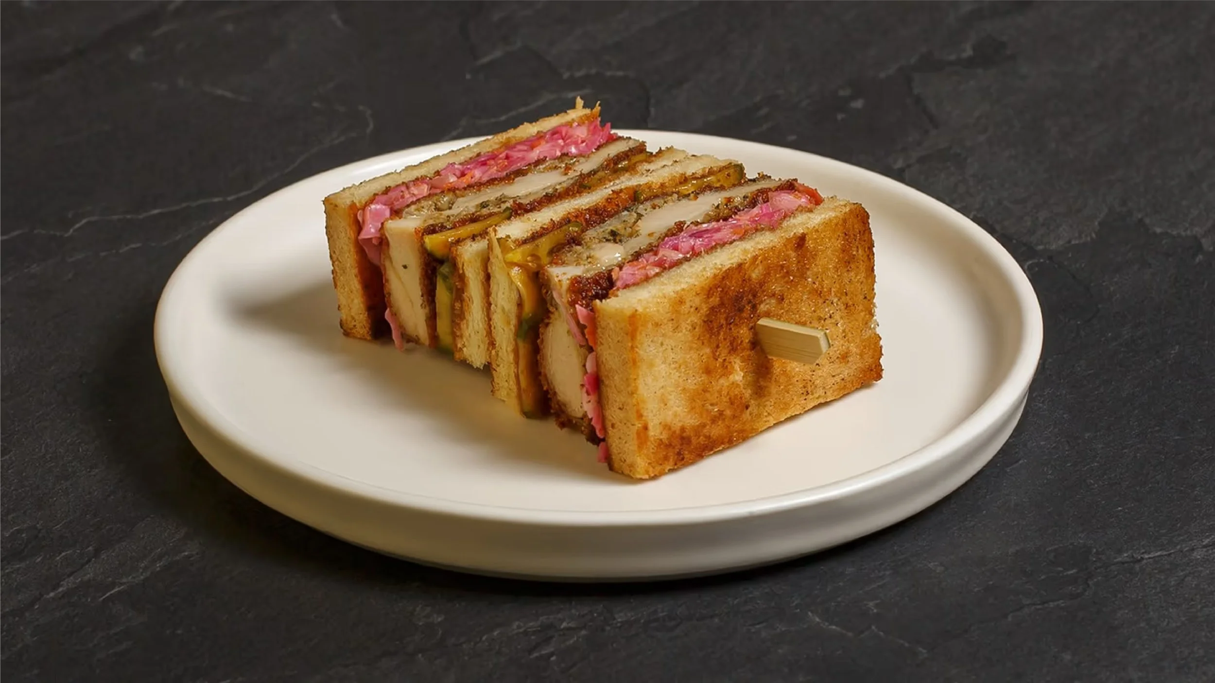 Milkread, Chicken Thigh Patty, Panko, Sweet Chili Mayo, Tonkatsu Sauce, Cucumber Pickles